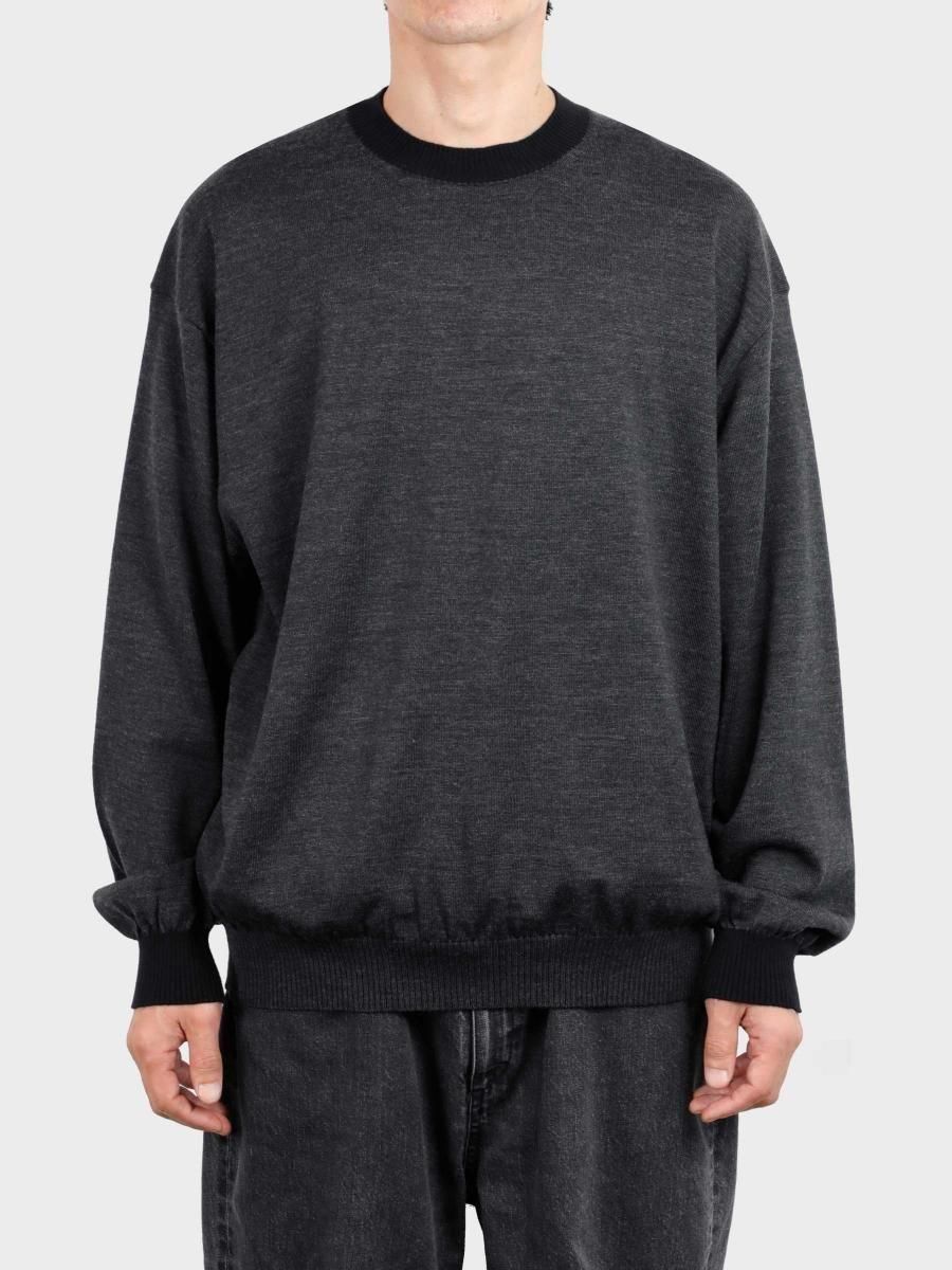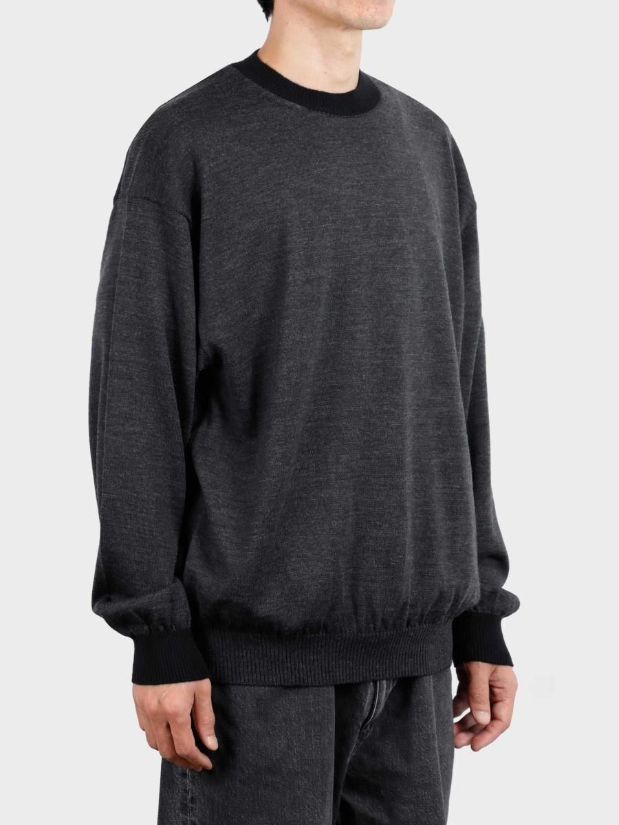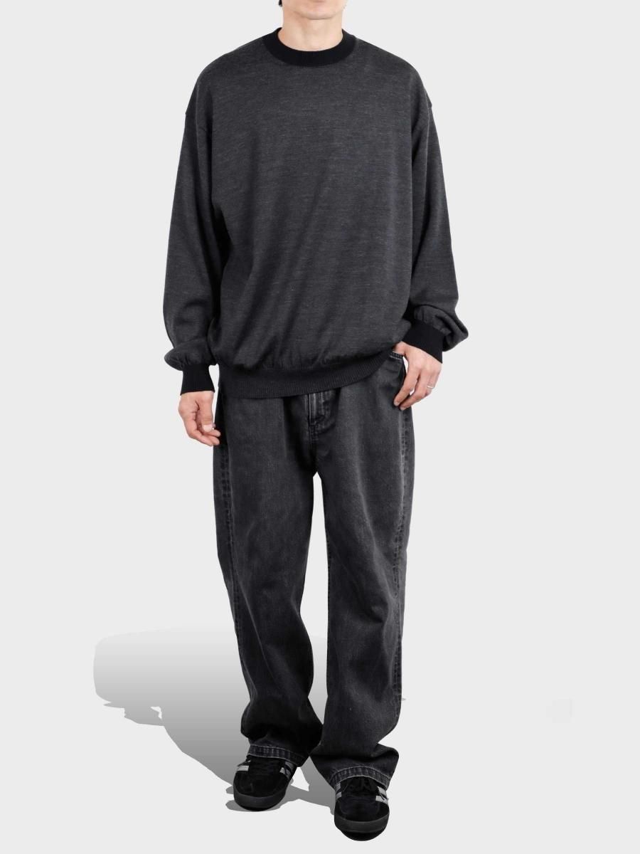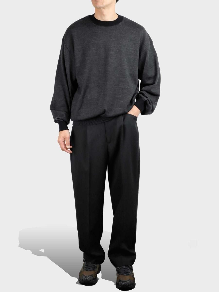 柔らかく滑らかなウールニットを使用しております。クルーネック仕様で、ネック袖のリブをブラックに切り替えされております。身幅を広め、着丈がやや短めのルーズシルエットに設定されております。