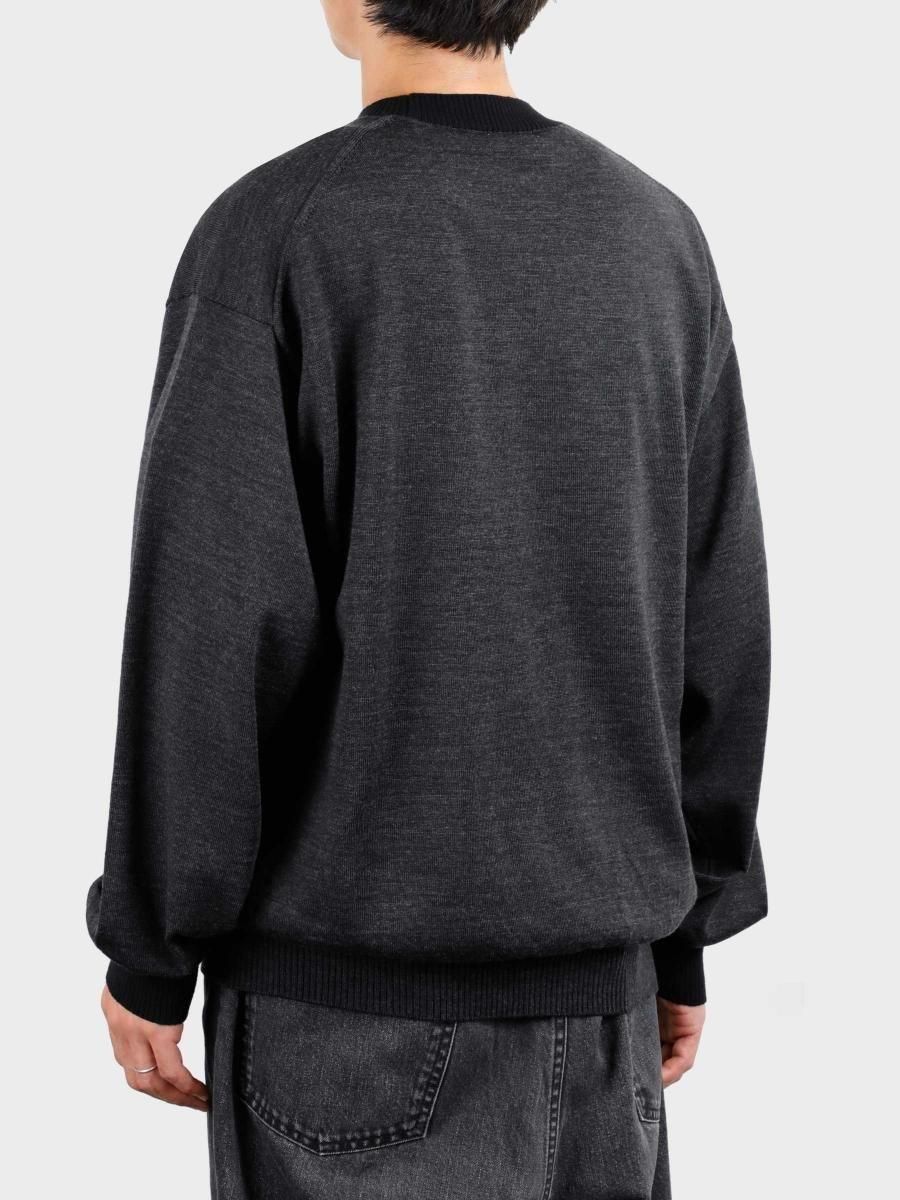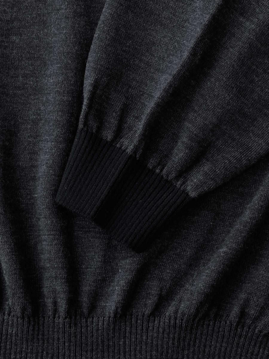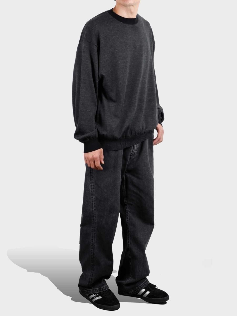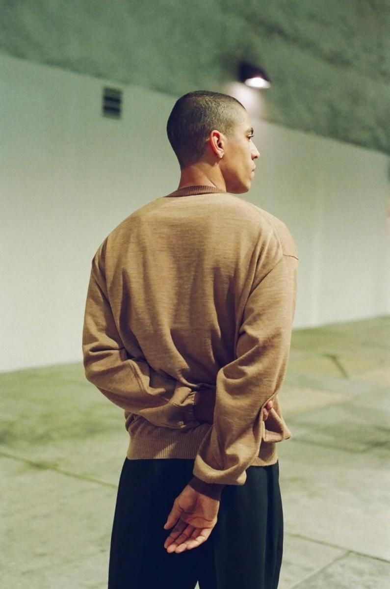 柔らかく滑らかなウールニットを使用しております。クルーネック仕様で、ネック袖のリブをブラックに切り替えされております。身幅を広め、着丈がやや短めのルーズシルエットに設定されております。