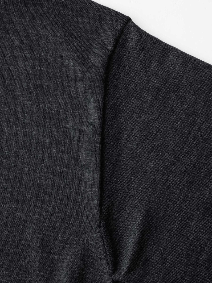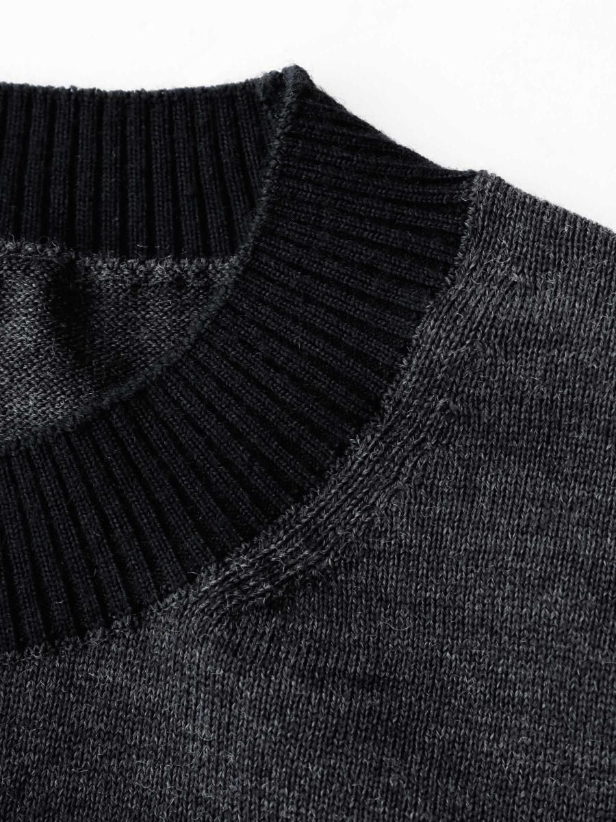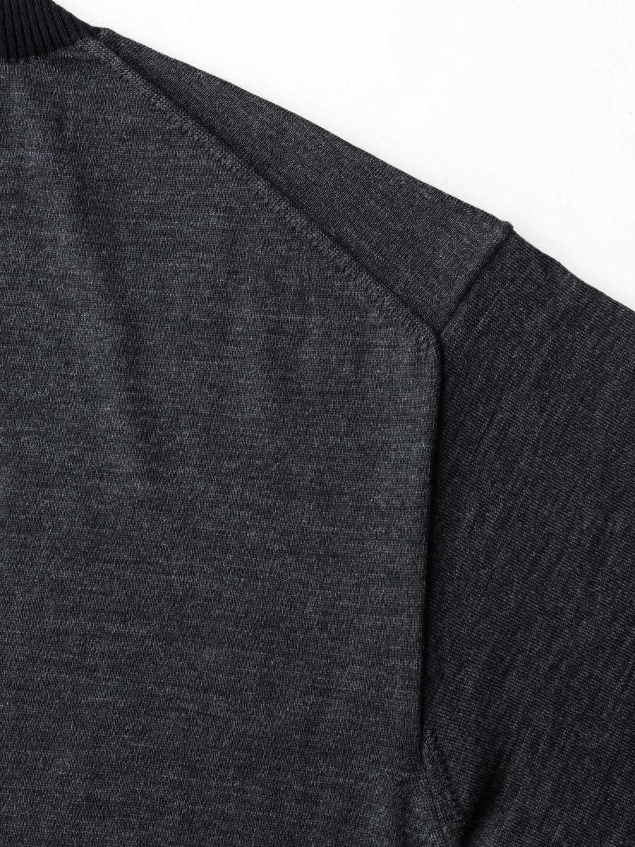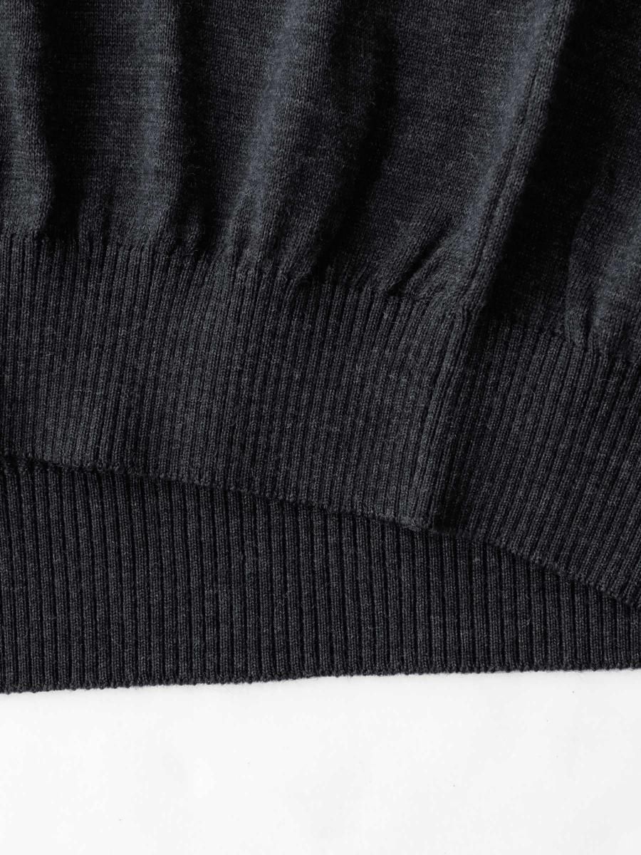 柔らかく滑らかなウールニットを使用しております。クルーネック仕様で、ネック袖のリブをブラックに切り替えされております。身幅を広め、着丈がやや短めのルーズシルエットに設定されております。