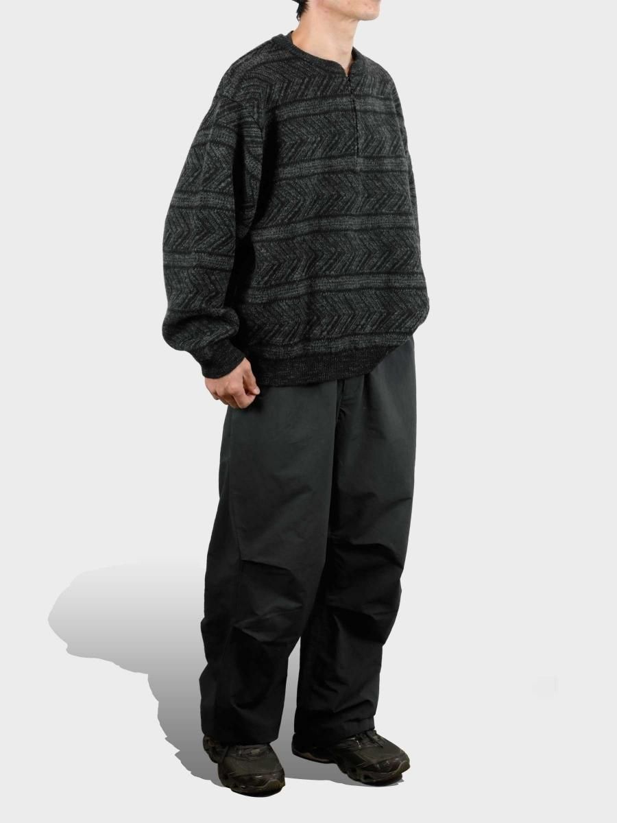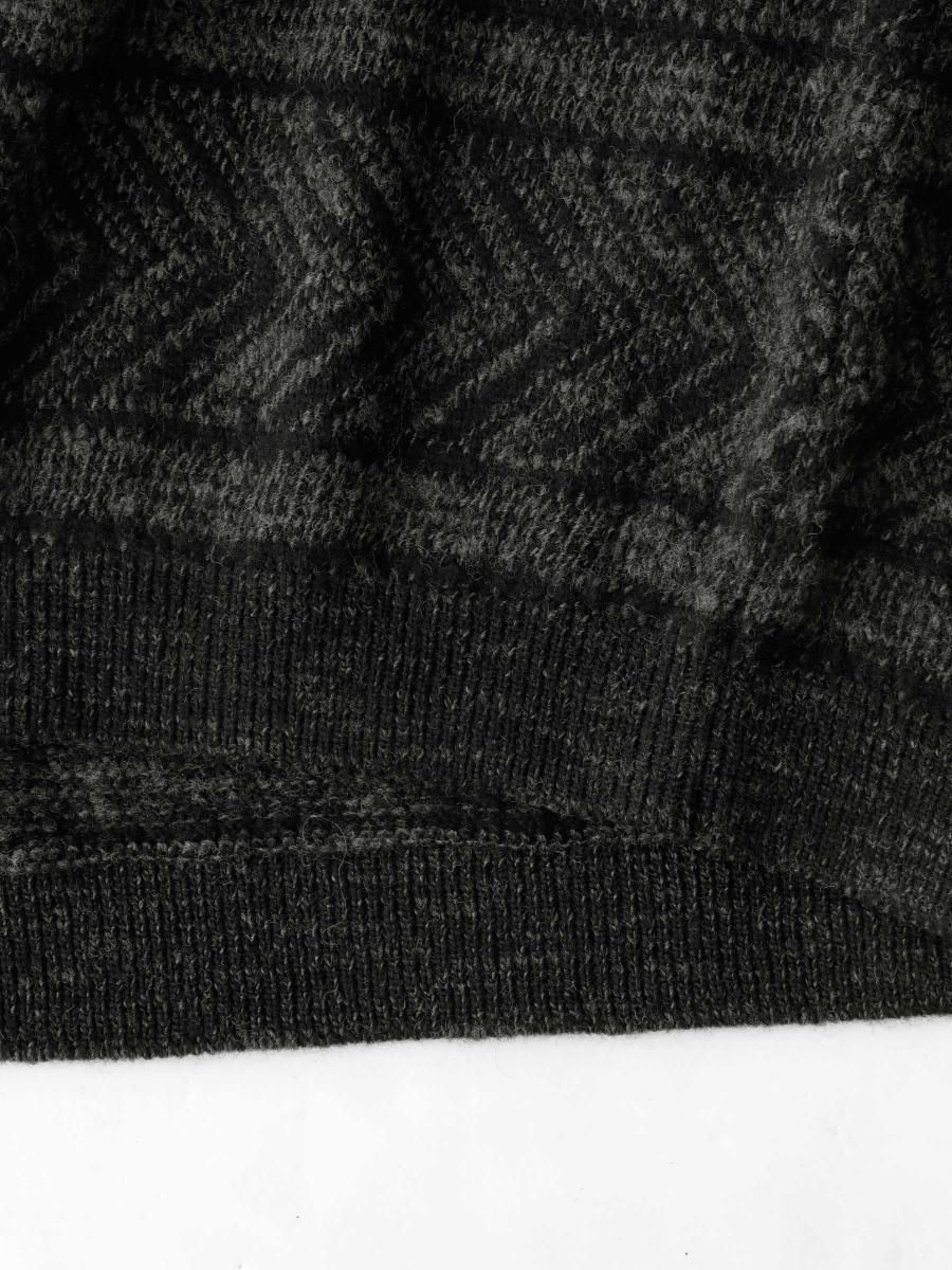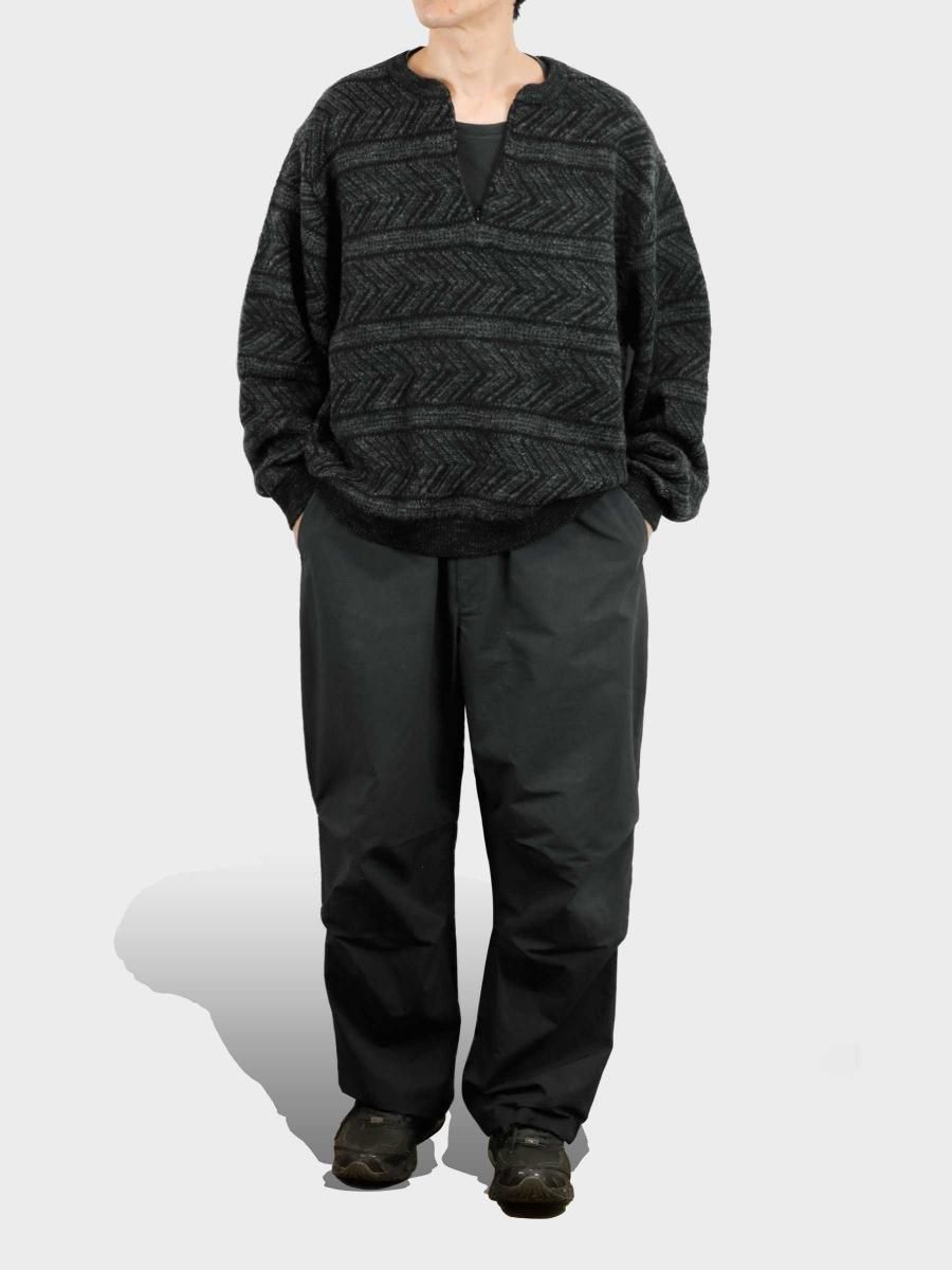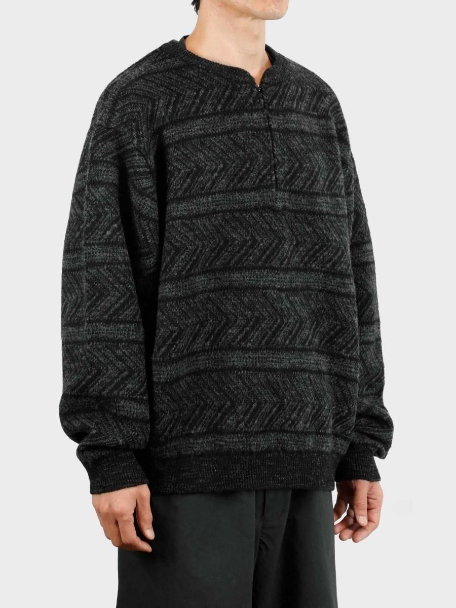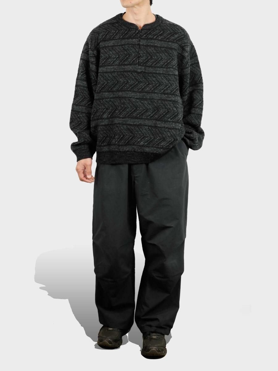 杢ビーバー糸を使用して織り上げられ、幾何学模を2パターン採用したオリジナルテキスタイルにて仕上げられた厚手のウール地を使用しております。肉厚で弾力性のある生地感も特徴となります。クルーネックのハーフジップ仕様、丈をやや短めに設定されたボックス型のルーズシルエットに仕上げられております。