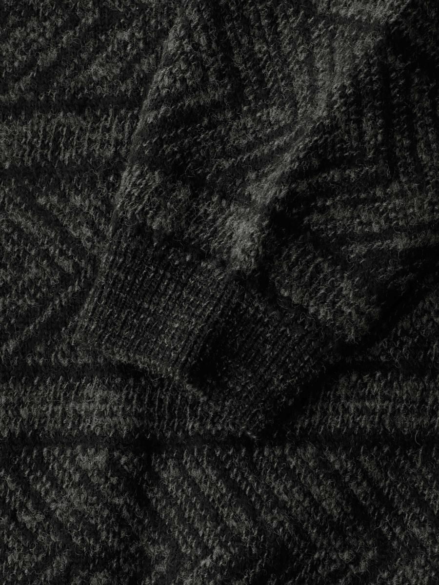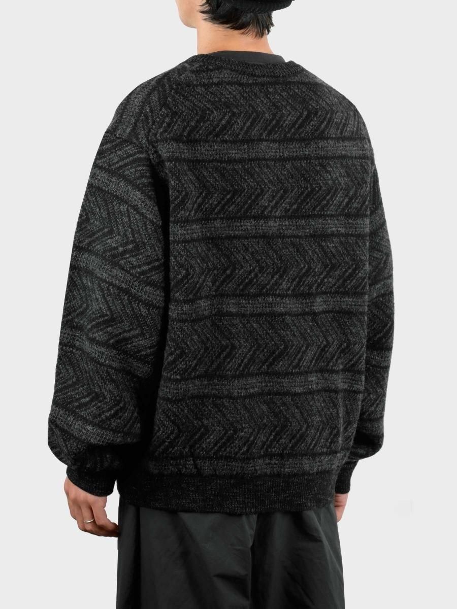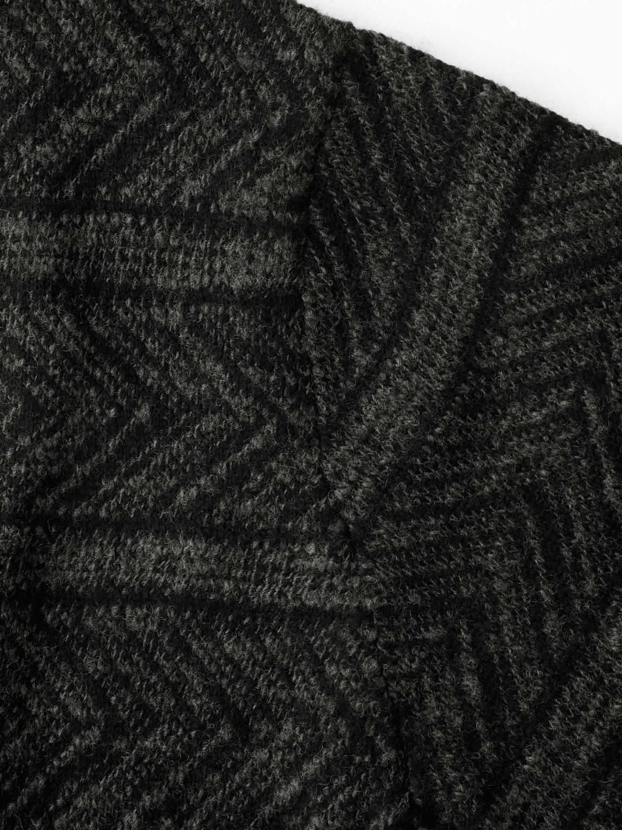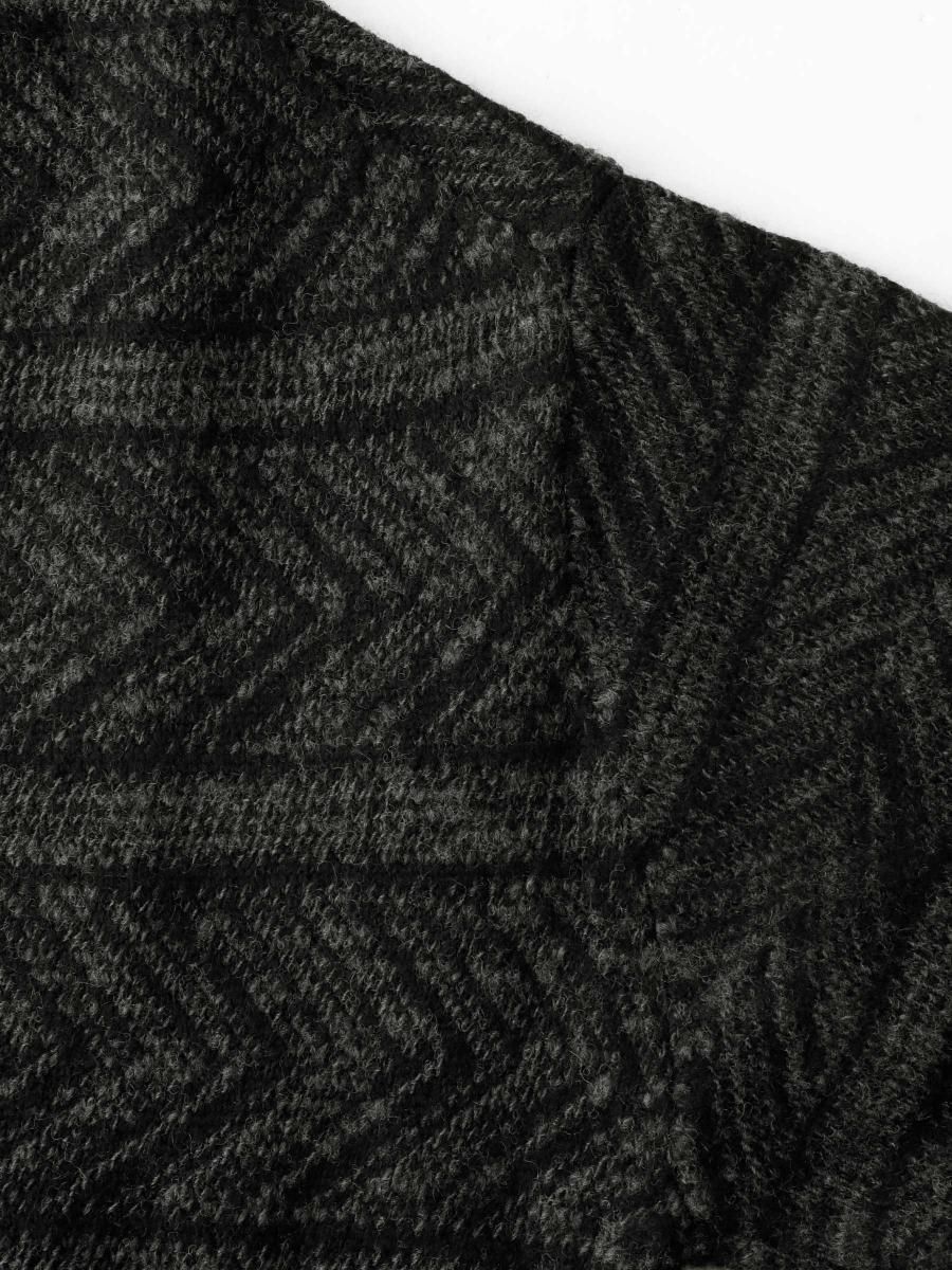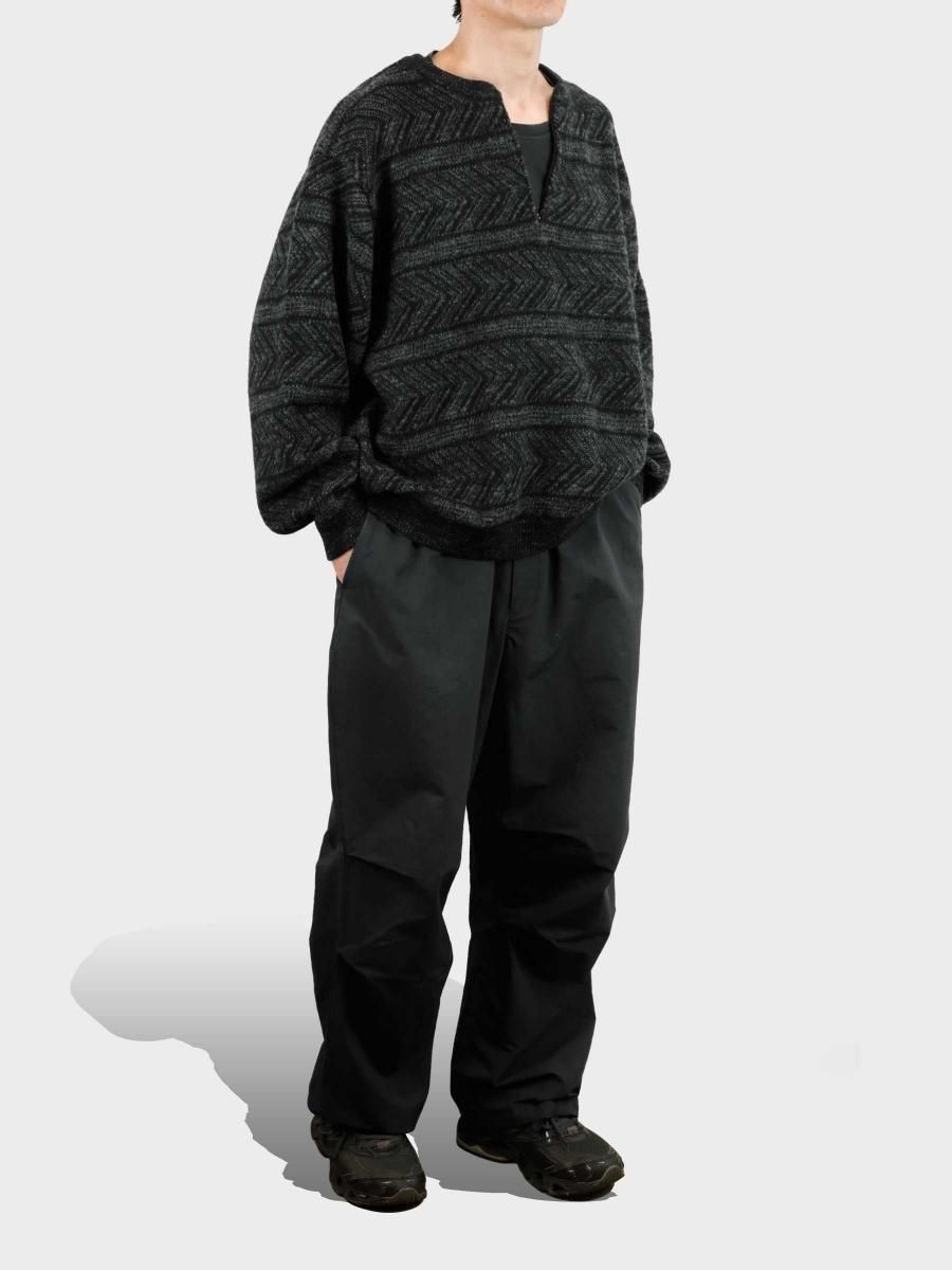 杢ビーバー糸を使用して織り上げられ、幾何学模を2パターン採用したオリジナルテキスタイルにて仕上げられた厚手のウール地を使用しております。肉厚で弾力性のある生地感も特徴となります。クルーネックのハーフジップ仕様、丈をやや短めに設定されたボックス型のルーズシルエットに仕上げられております。