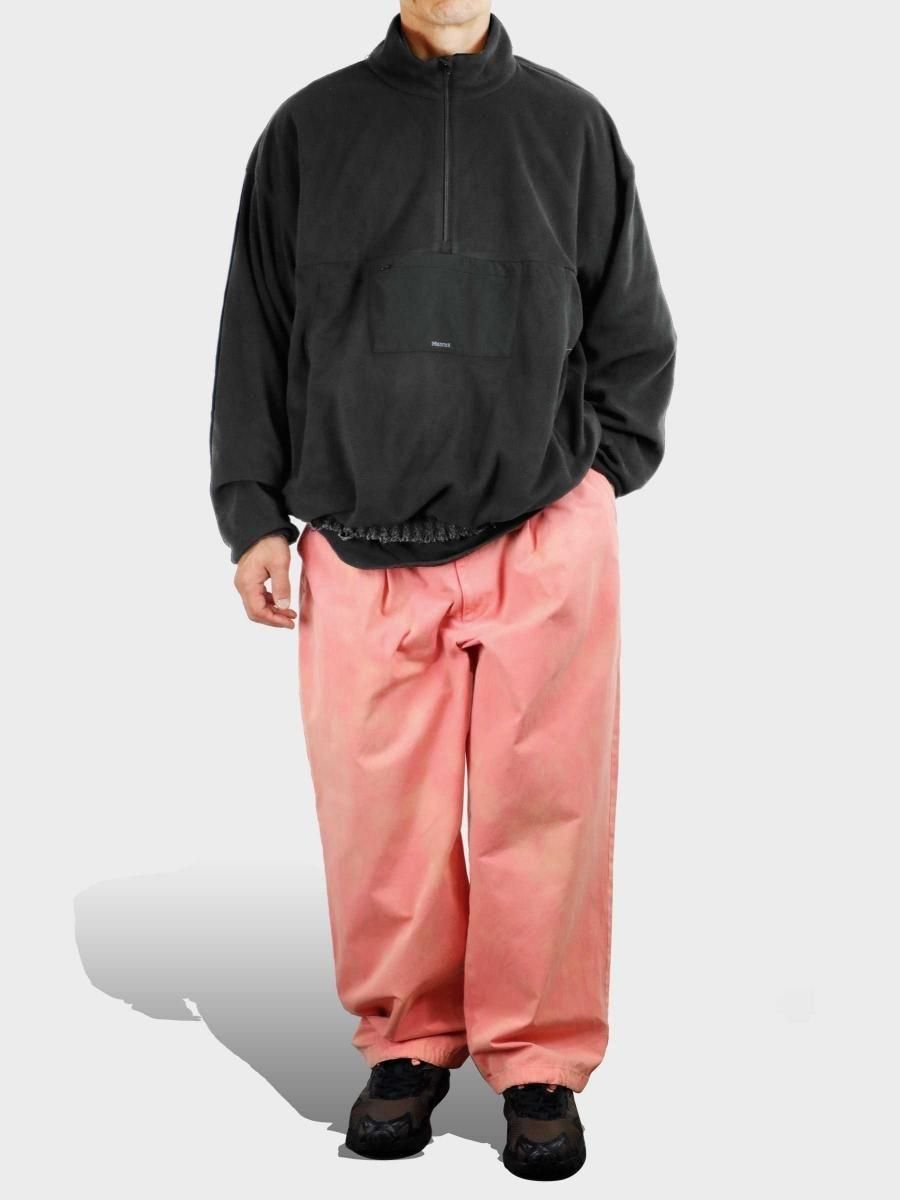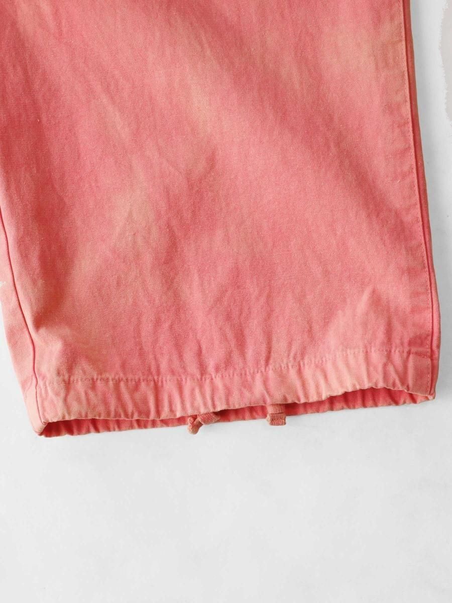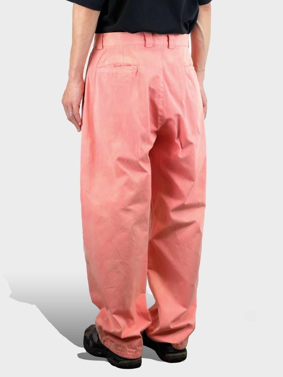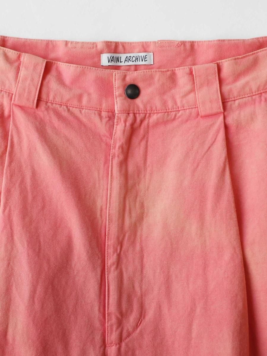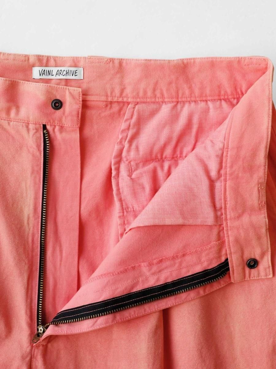 VAINL ARCHIVEのコットンのミリタリーウェザーを使用したワイドパンツになります。 ハリとコシを持たせた高密度のミリタリーウェザー生地を使用し、製品染め後に特殊加工が施されております。独特の起毛したフェード感と風合いにて制作されております。腰回りから膨らみを持たせ、ややテーパードされたワイドシルエットに、裾をスピンドル仕様にて制作されております。スピンドルの開閉によりシルエットが調整可能となります。 MATERIAL : COTTON 100% COLOR : PEACH size S : ウエスト82.0cm / 全長102.0cm / 股上43.0cm / 股下69.0cm / ヒップ124.0cm / もも周り75.0cm / 裾幅49.0cm size M : ウエスト84.0cm / 全長104.0cm / 股上44.0cm / 股下70.0cm / ヒップ126.0cm / もも周り76.0cm / 裾幅50.0cm size L : ウエスト86.0cm / 全長106.0cm / 股上45.0cm / 股下68.0cm / ヒップ128.0cm / もも周り77.0cm / 裾幅51.0cm MODEL : 身長172cm / 体重55kg / 着用サイズ M WASHING : MADE IN JAPAN