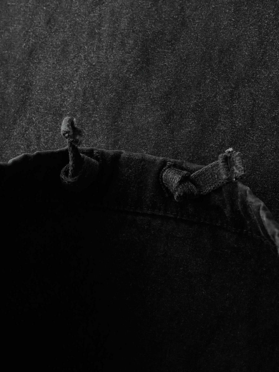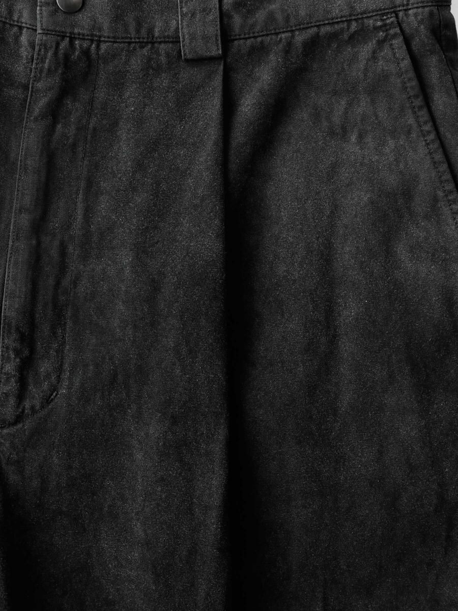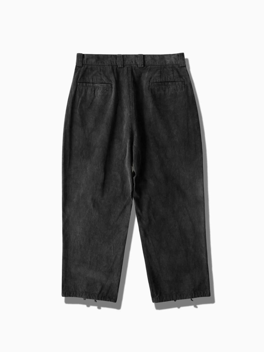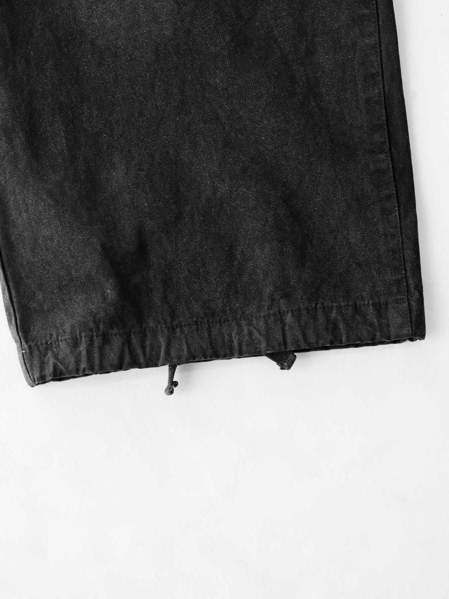 VAINL ARCHIVEのコットンのミリタリーウェザーを使用したワイドパンツになります。 ハリとコシを持たせた高密度のミリタリーウェザー生地を使用し、製品染め後に特殊加工が施されております。独特の起毛したフェード感と風合いにて制作されております。腰回りから膨らみを持たせ、ややテーパードされたワイドシルエットに、裾をスピンドル仕様にて制作されております。スピンドルの開閉によりシルエットが調整可能となります。 MATERIAL : COTTON 100% COLOR : BLACK size S : ウエスト82.0cm / 全長102.0cm / 股上42.0cm / 股下69.0cm / ヒップ124.0cm / もも周り75.0cm / 裾幅49.0cm size M : ウエスト84.0cm / 全長104.0cm / 股上43.0cm / 股下70.0cm / ヒップ126.0cm / もも周り76.0cm / 裾幅50.0cm size L : ウエスト86.0cm / 全長106.0cm / 股上44.0cm / 股下68.0cm / ヒップ128.0cm / もも周り77.0cm / 裾幅51.0cm MODEL : 身長172cm / 体重55kg / 着用サイズ M WASHING : MADE IN JAPAN