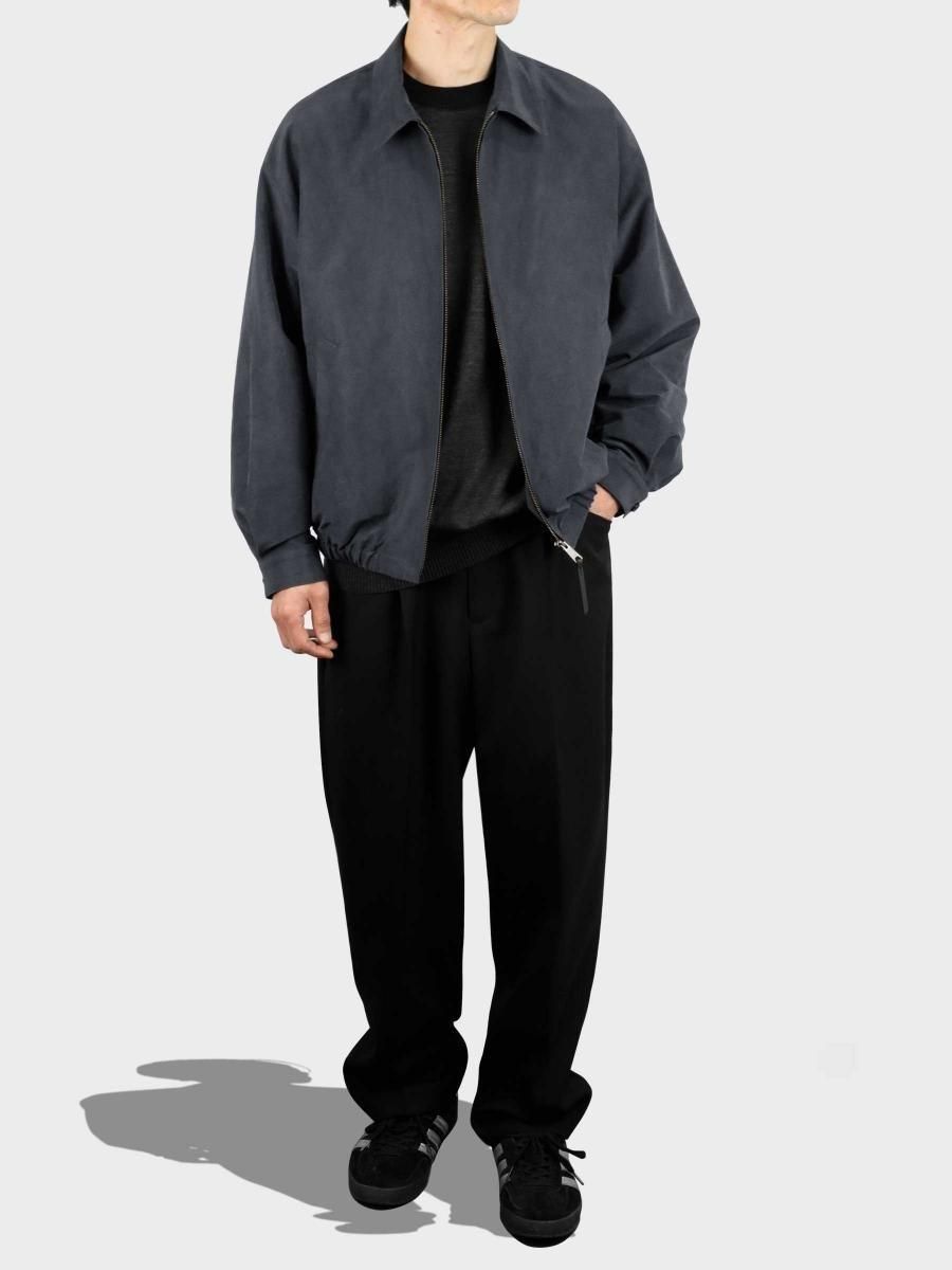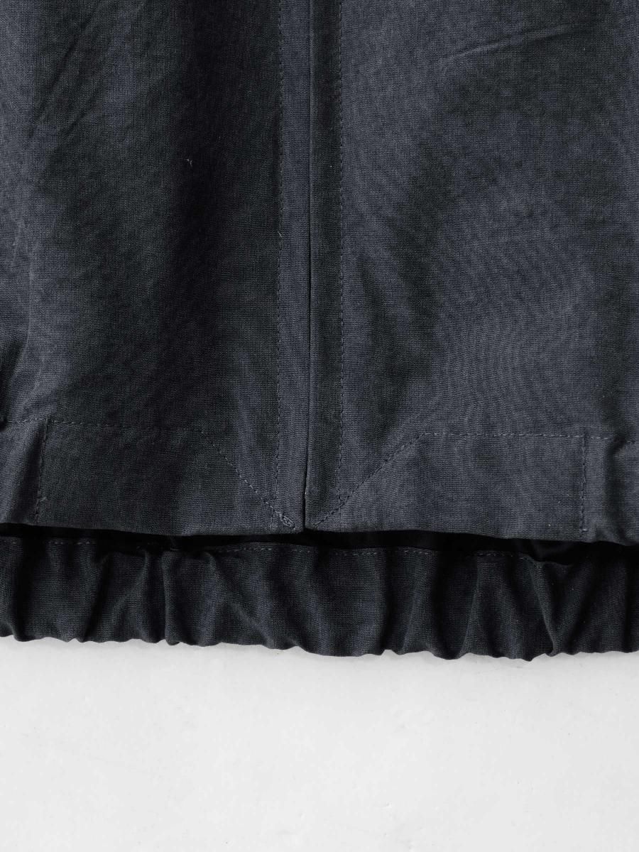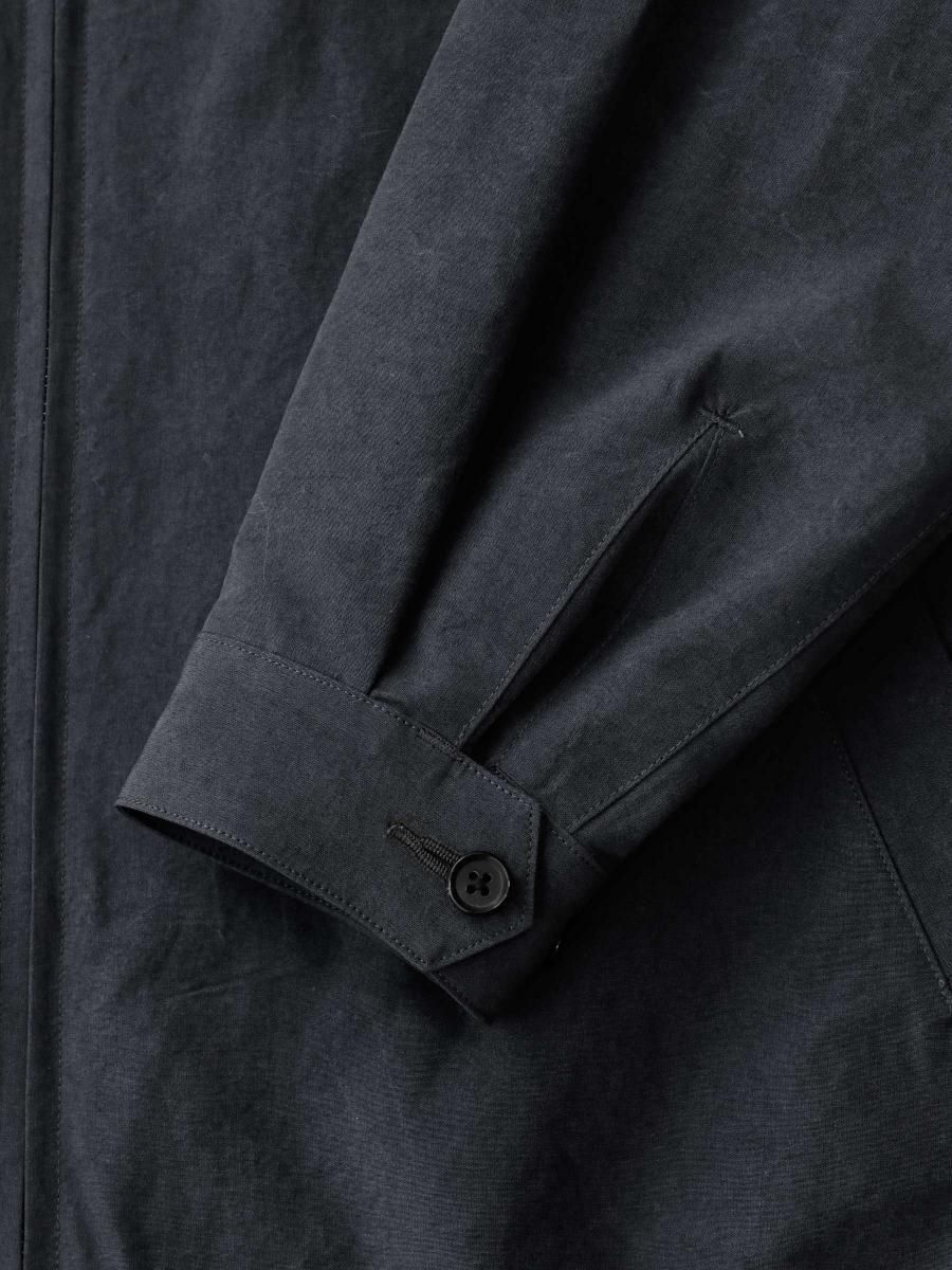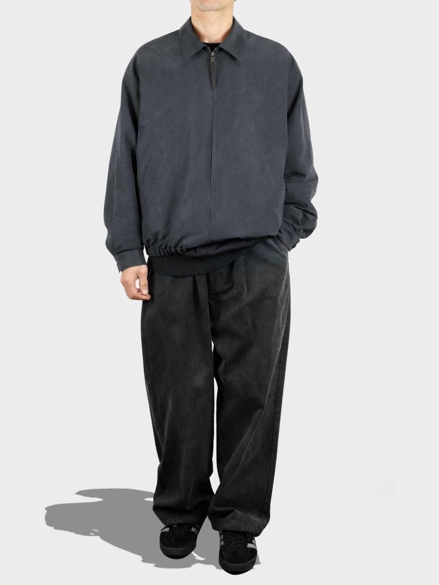 6A等級のシルク双糸、太番手の綿を打ち込むことでハリ感のある生地に仕立てられております。この生地にワッシャー機で硫化染めアタリ加工が施されており、スウェードタッチな滑らかな肌触りに仕上げられております。身幅を広め、着丈を短めに設定されたボックス型シルエットにて制作されております。
