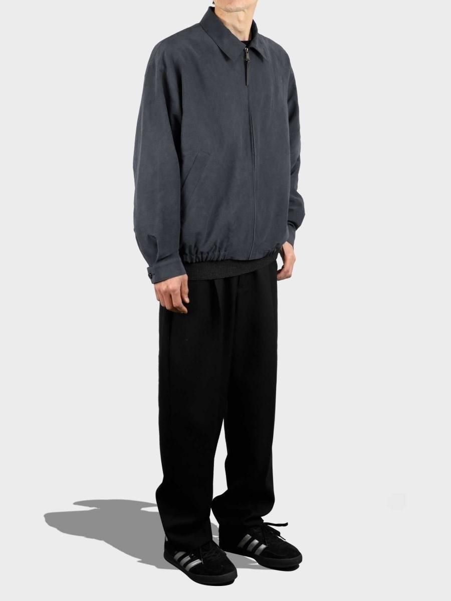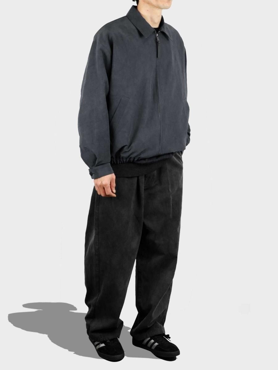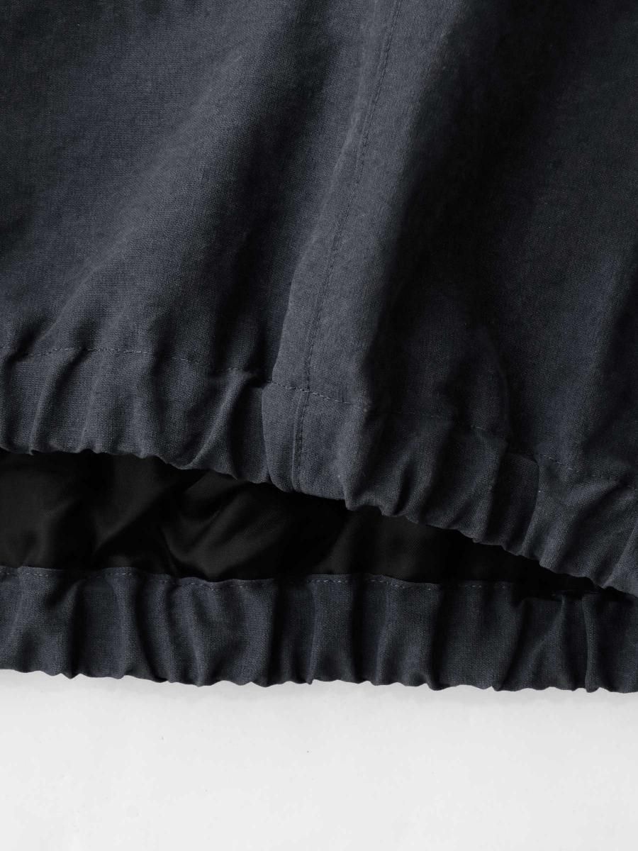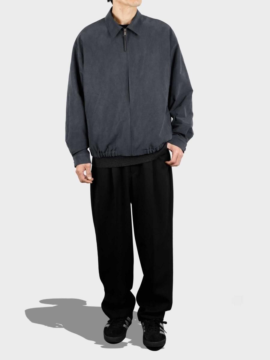 6A等級のシルク双糸、太番手の綿を打ち込むことでハリ感のある生地に仕立てられております。この生地にワッシャー機で硫化染めアタリ加工が施されており、スウェードタッチな滑らかな肌触りに仕上げられております。身幅を広め、着丈を短めに設定されたボックス型シルエットにて制作されております。