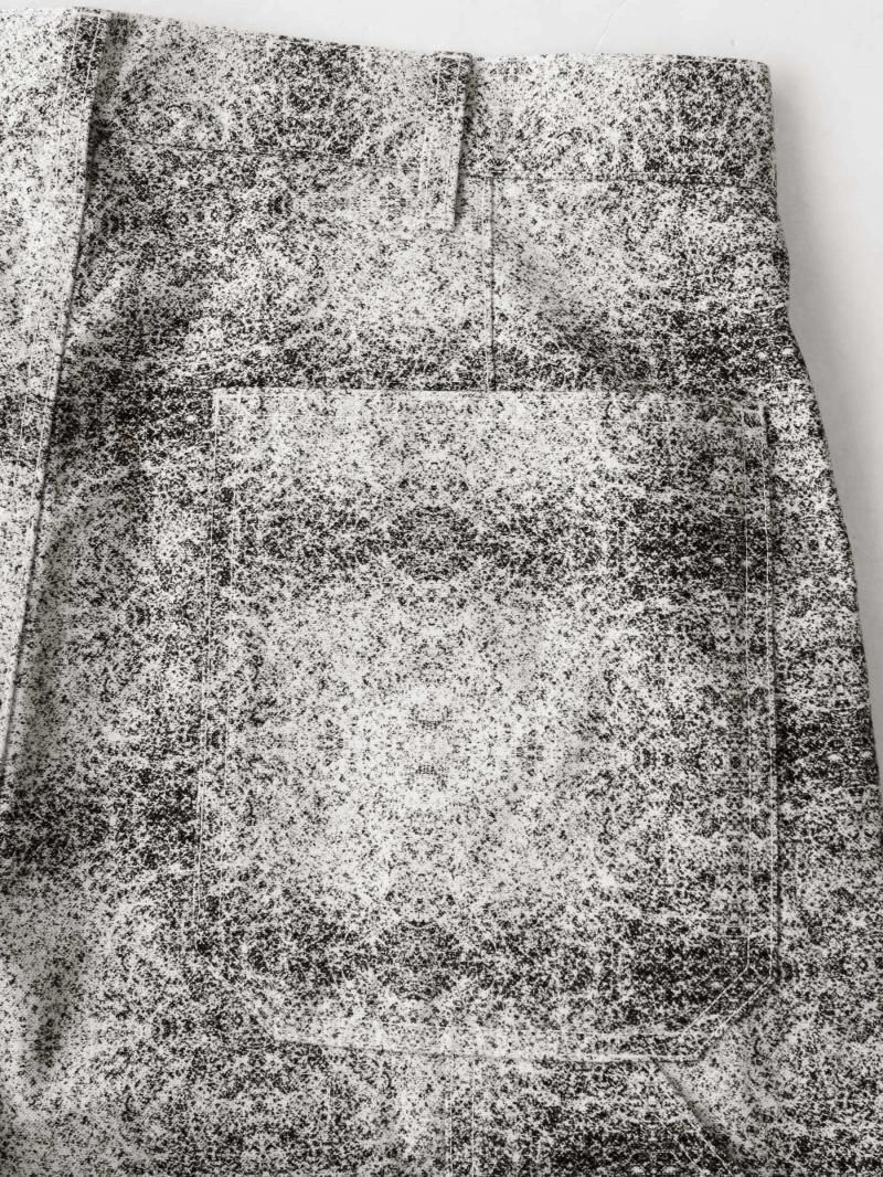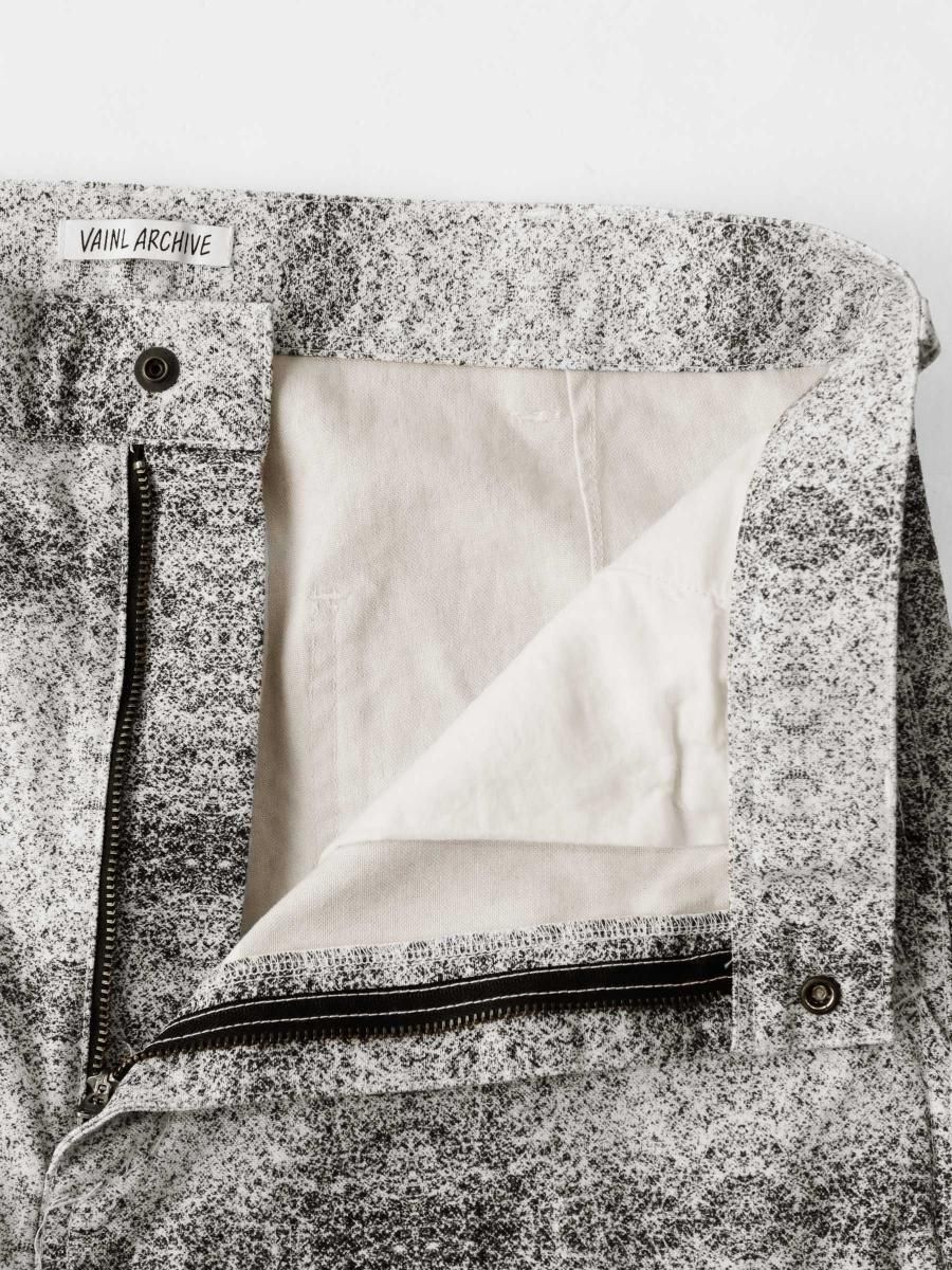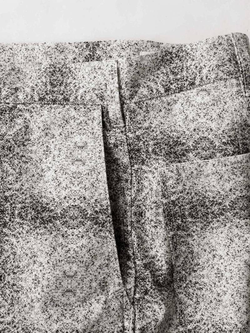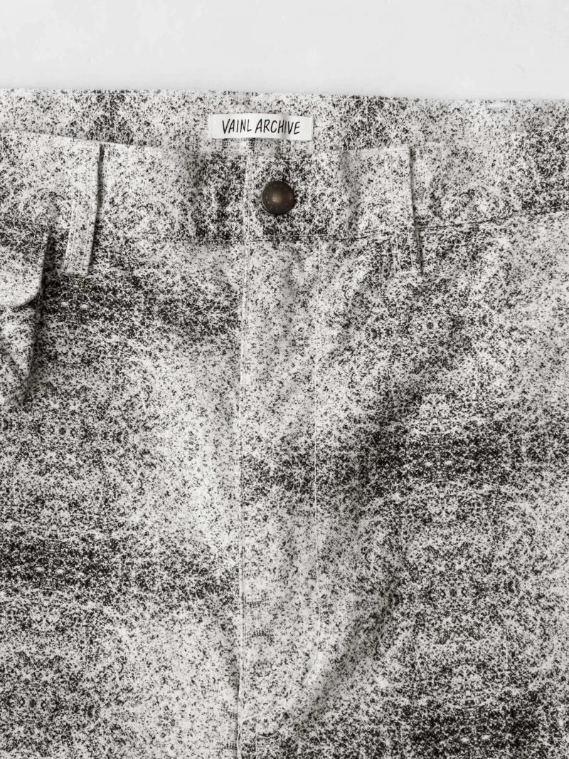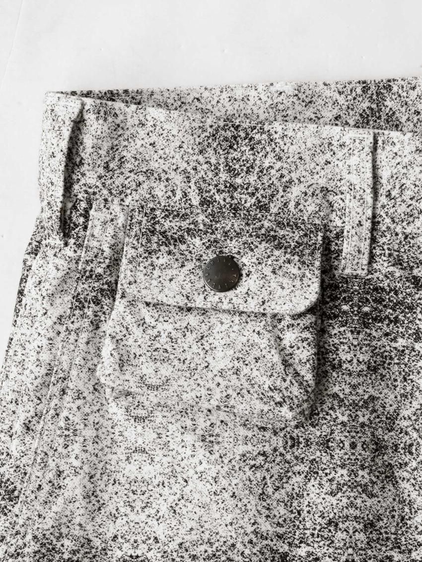 VAINL ARCHIVEのダック生地にクラッシュプリントが施されたペインターパンツになります。 オリジナルの目面の細かく綺麗なダック生地にクラッシュプリントを施した後、製品洗いにてオリジナルテキスタイルに制作されております。フロントウエスト部にポケットを設け、ワークのペインターパンツベースに制作されております。腰回りから膨らみを持たせ、ややテーパードされたワイドシルエットになります。同素材のAZIZ-Cとセットアップでの着用が可能となります。 MATERIAL : COTTON 100% COLOR : CRASH PRINT size S : ウエスト83.0cm / 全長104.0cm / 股上41.0cm / 股下65.0cm / ヒップ106.0cm / もも周り67.0cm / 裾幅49.0cm size M : ウエスト85.0cm / 全長106.0cm / 股上42.0cm / 股下66.0cm / ヒップ108.0cm / もも周り68.0cm / 裾幅50.0cm size L : ウエスト87.0cm / 全長108.0cm / 股上43.0cm / 股下67.0cm / ヒップ110.0cm / もも周り69.0cm / 裾幅51.0cm MODEL : 身長172cm / 体重60kg / 着用サイズ M WASHING : MADE IN JAPAN